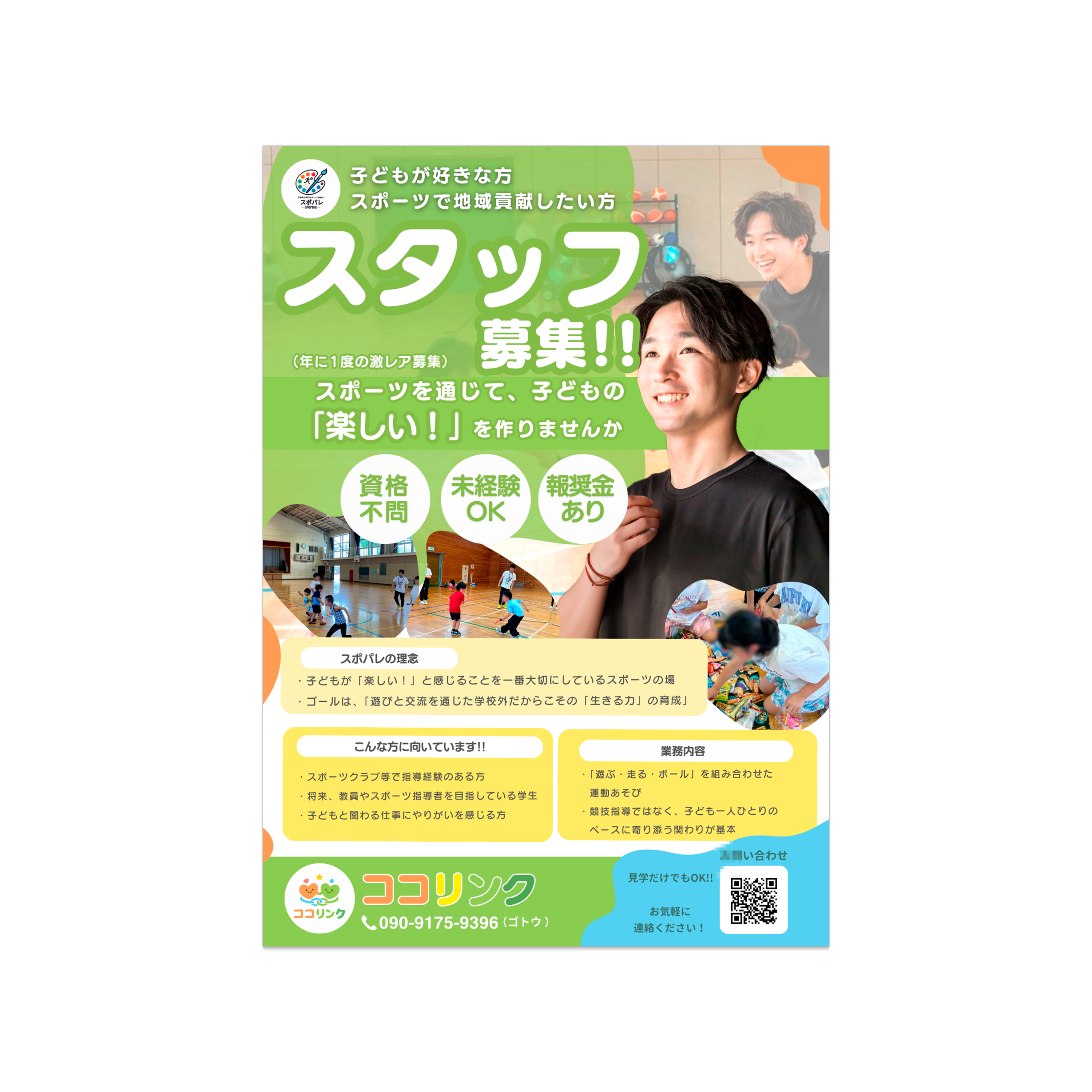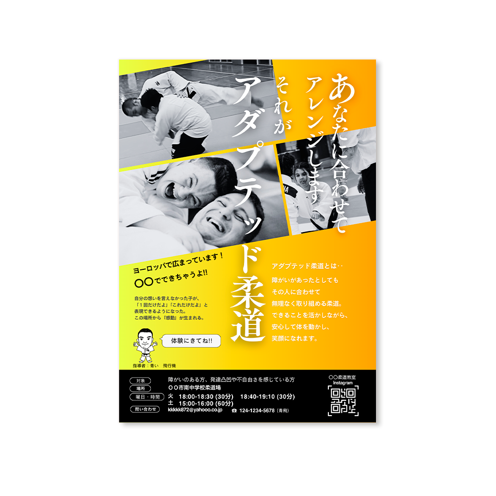 今回は柔道教室の短期冬期講座のチラシを作ってもらいました。自分のしたいと思っていたことを、お客さんはこないのではないかと気づくことができました。私の想像を超える素晴らしいデザインでした。また、お願いします。